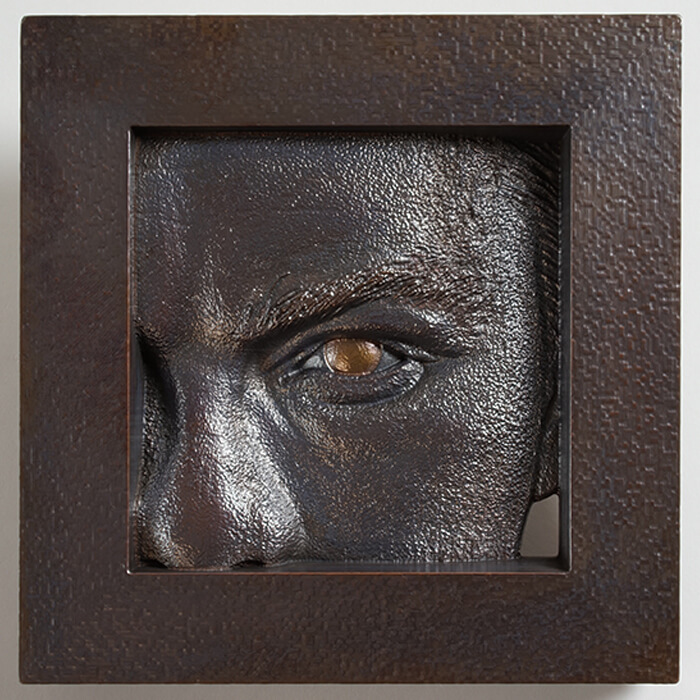 150ミリ四方の銅製。人の顔の一部を切り取り、メダル中央に配置した目の光彩には真鍮を埋め込みました。
